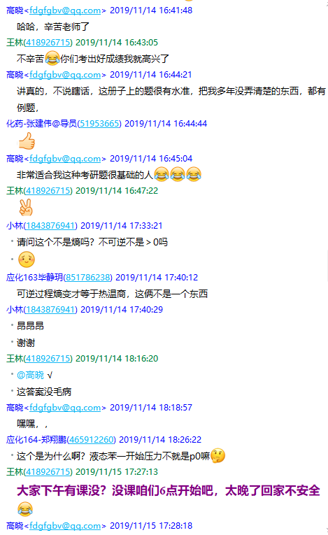 本人在执教物理化学的十余年间,一直关注学生考研情况,坚持每年义务辅导有考研需要的学生,帮助他们选择专业和备考,有着丰富的经验。近5年来,物理化学在研究生入学考试中所占的比重越来越大,因此越发受到学校和age动漫 的重视。为此,本人于2019年联合了兰州大学、吉林大学、东北师范大学、陕西师范大学、长安大学等五所名校的几位一线教师,将《物理化学》中的重点、难点、考点问题以及大量学习资源进行分类整合,编纂了一本《<物理化学>类型题训练及解析》,作为我校学生的考研辅导材料,并利用业余时间在线下集中辅导考研学生,讲解难题、传授答题技巧。同年底,应用化学2016级本科生考研通过率显著提高,学生普遍认为这次集中辅导的作用非常大(图6)。在本人的悉心辅导下,在课题组做毕业设计的5位本科生全部都考上了一流高校和科研院所(吉林大学、同济大学、中科院长春应化所)。