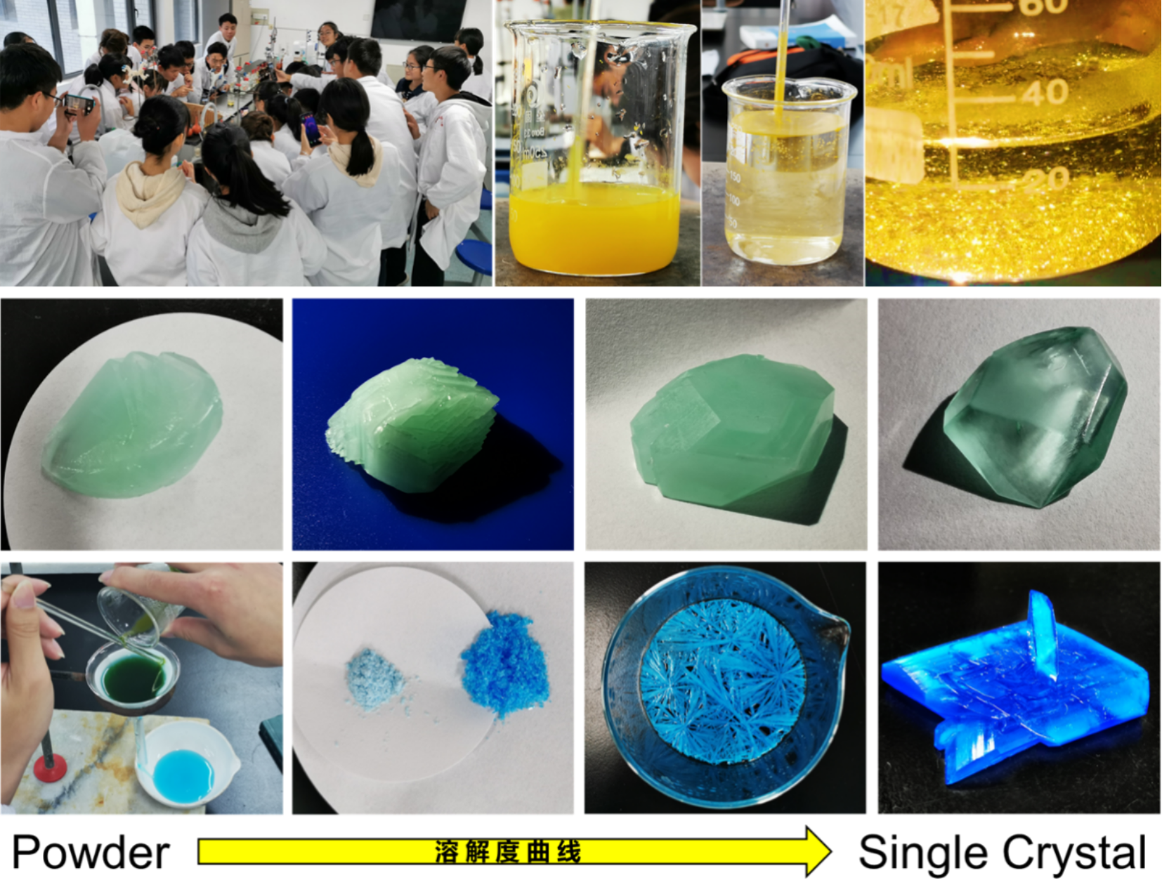 合成实验定量制备;这类实验过程环环相扣,学生总怕“一步走错”,引起“满盘皆输”。但该类实验又具有极强的视觉冲击力,所以格外受学生追捧。其中,三个单晶的制备实验——“黄金雨”碘化铅、“蓝宝石”五水合硫酸铜、“绿宝石”七水合硫酸亚铁铵——尤为引人关注。age动漫 21级03、04班有不少同学还曾多次主动申请利用课外时间重复实验。该类实验的核心是利用化合物溶解度曲线,通过精细调控溶质浓度、溶液体积、冷却和溶剂挥发速度等因素,实现纳米晶、粉末多晶或针、块状单晶体的培养。课堂中,除去让同学去搜集不同晶体在军民领域的用途外,我们还组织学生汇集产品做“晶体选美”大赛。并对于各尺寸、形状、品相的晶体逐一分析,定量讨论晶体生长的更优方案。毕竟“培养晶体不是撞大运,更不是玄学,能够重复和重现的才能被称为科学实验”。