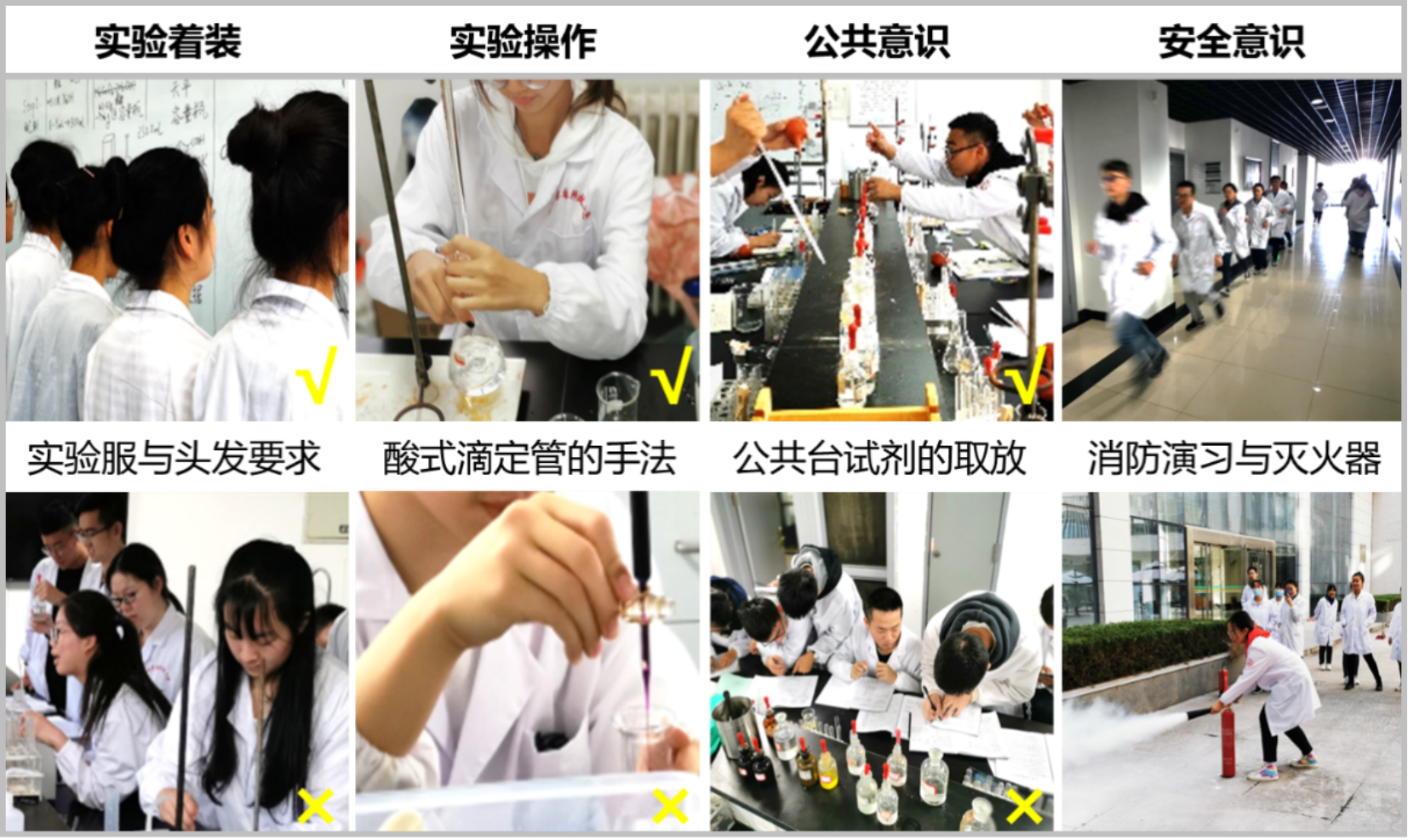 普化原理实验是大一新生的首门实验课,也是他们养成实验室行为习惯的关键时期。相较理论课而言,本课程单次时间更持久(4小时),人员活动更杂乱(约30人同时动手),因而实现精细化课堂管理较为困难。本人主要尝试从以下两方面进行把控,实现新生实验室行为习惯的培养。
