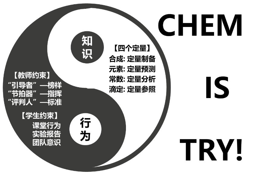 本文旨在介绍作者在先辈同行的工作基础上,以“行知合一”为理念,尝试的一小部分实验课程改革举措,主要包括:行为习惯培养(行为层面)、逻辑思维引导(知识层面)和双向评价体系。文中如有疏漏或偏见之处,仅为笔者的臆断和尝试,以此契合本学科的宗旨——Chem is try!(化学即尝试!)