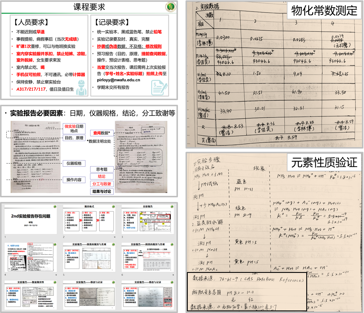 图3 左(上至下):学生行为约束细则,实验报告的规范示例,学期中汇总的实验报告问题及解决方案;右:学生的实验记录,包含数据的修改、数据分享贡献、重要热力学常数的数值及来源、性质实验定量讨论。