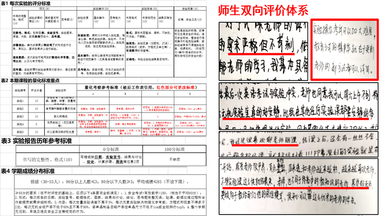 本课程采用师生双向的评价方式,首先,精细量化了学期中所有实验的评分标准,保证成绩评定依据内容高于形式(绝不只看报告的美丑或操作程度,更注重有深度的数据分析);其次,由于学校的实验、实践类课程没有学生评教,因此我增加了实验课学生课程意见的问卷,让学生对难忘的、渴望的、畏惧的、不满的实验室点点滴滴进行回忆,并对课程设置、指导教师进行评价,以及对下一级同学提出些许要求和建议。在提交学生成绩后,收集问卷中的建议和意见(防止自己的主观情绪影响学生成绩),融入下一年度的教学当中(每年学生提出的合理举措,都会实施,否则后面的学生就没有提意见的积极性了)。