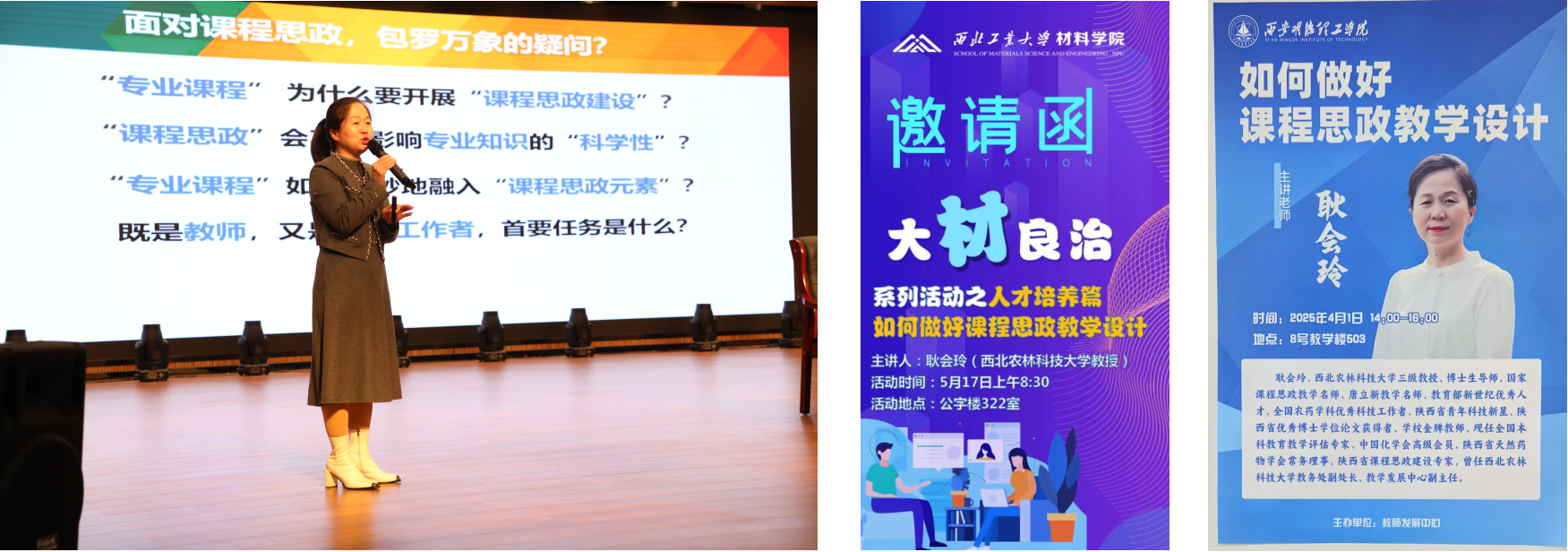 《生物有机化学》课程于2021年入选“首批国家课程思政示范课程”、学校精品示范课、学校教材建设重点项目,教学团队获评“国家课程思政教学团队”,耿会玲教授和团队成员获评“国家课程思政教学名师”,教学案例——青蒿素及其衍生物研究进展入选“陕西省教学案例”。