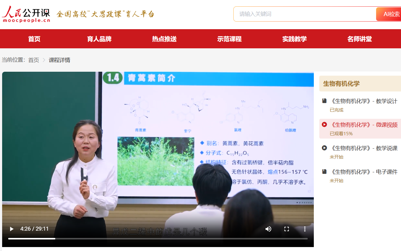 该课程已于4月份入选人民网公开课,累积学习人数5841人。该课程连续入选国家级教育平台,既是age动漫 重视思政课程建设的重要体现,也是落实立德树人根本任务的喜人成果。今后,age动漫 将持续深化课程思政建设,强化“农化融合”特色,构建高质量人才培养体系,培养更多知农爱农的卓越化学人才,为建设农业强国、推进中国式现代化作出新的贡献。