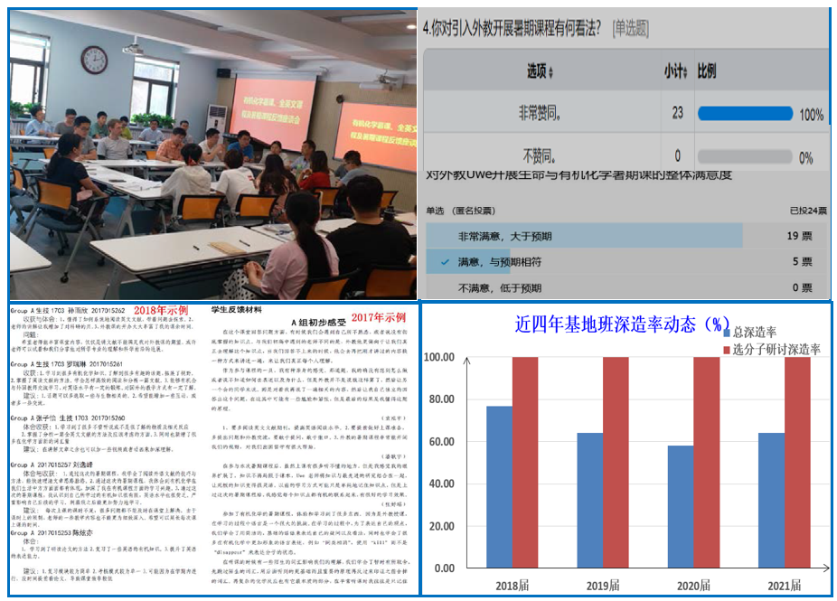 通过外教每节课进行课堂即时在线调查、结课后每位学生提交电子版材料以及集体座谈会收集意见等多种方式,及时反馈教学意见和教学效果。《生命与有机化学》分子研讨课共实施了5期13个小班,反馈调查显示,94%的学生认为课程对自己非常有用,92%的学生享受这种教学过程,认为小组互动讨论加深对跨学科知识点理解,通过这种学习,英语表达自信心大为提高。在2018年的结课座谈会上,所有的学生用英文反馈意见。在一次回访座谈会上,学过的高年级学生反映,研讨课教学有利于大学生科创实验更早开展,开展课题研究英文文献阅读能力大大提升。从学生培养后效来看,近4年创新基地班学生深造,选分子研讨课学生深造率比总深造率均高20%以上。