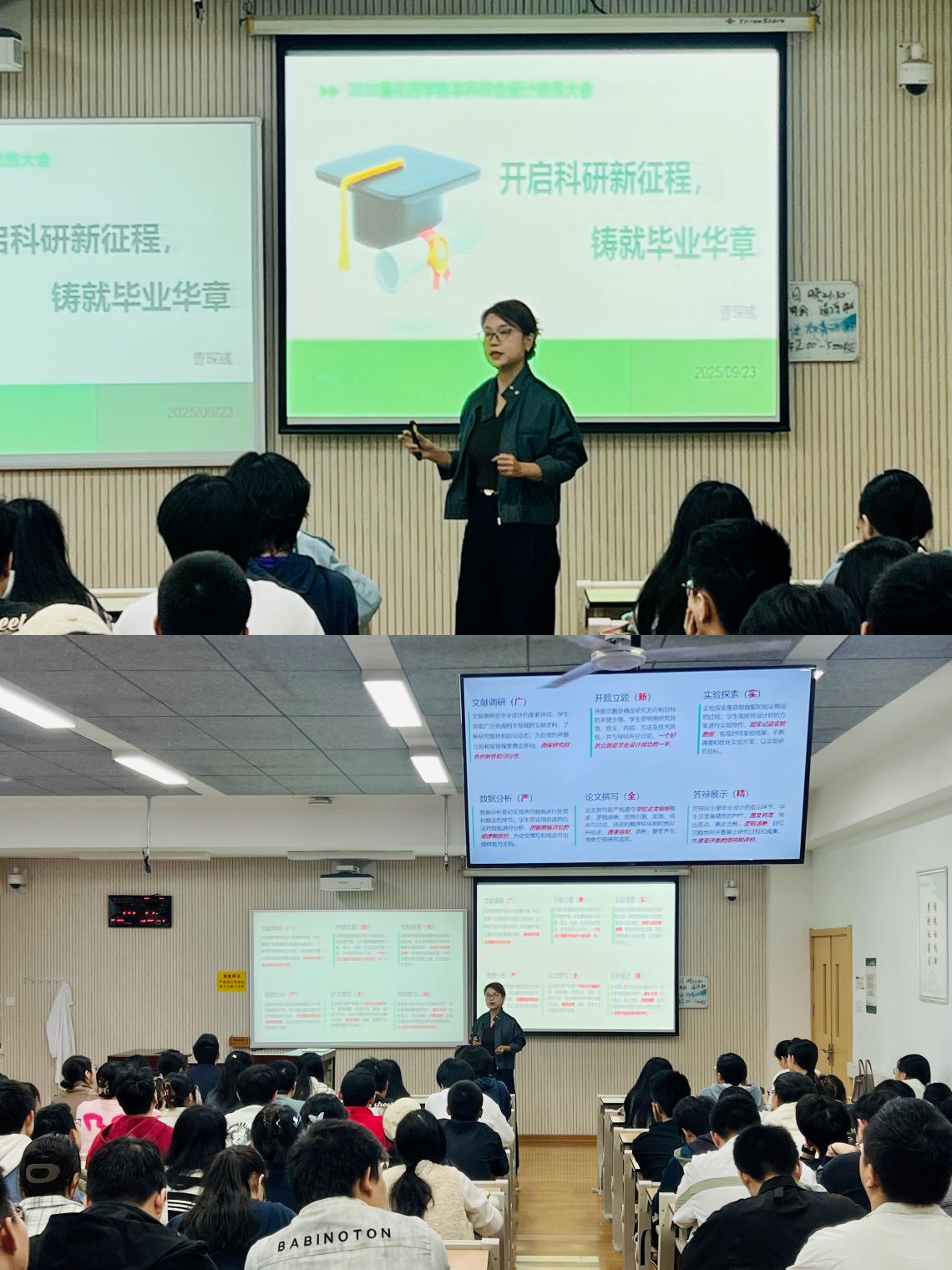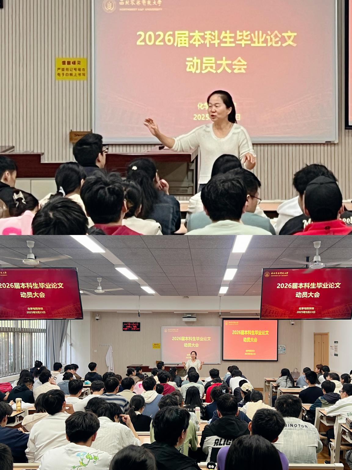 9月23日下午,age动漫 在八号楼N8116教室召开了2022级本科生毕业论文动员会。会议由张继文副院长主持,应用化学系主任耿会玲教授、化学生物学系副主任曹琛彧副教授及2022级126名学生参加了此次大会。