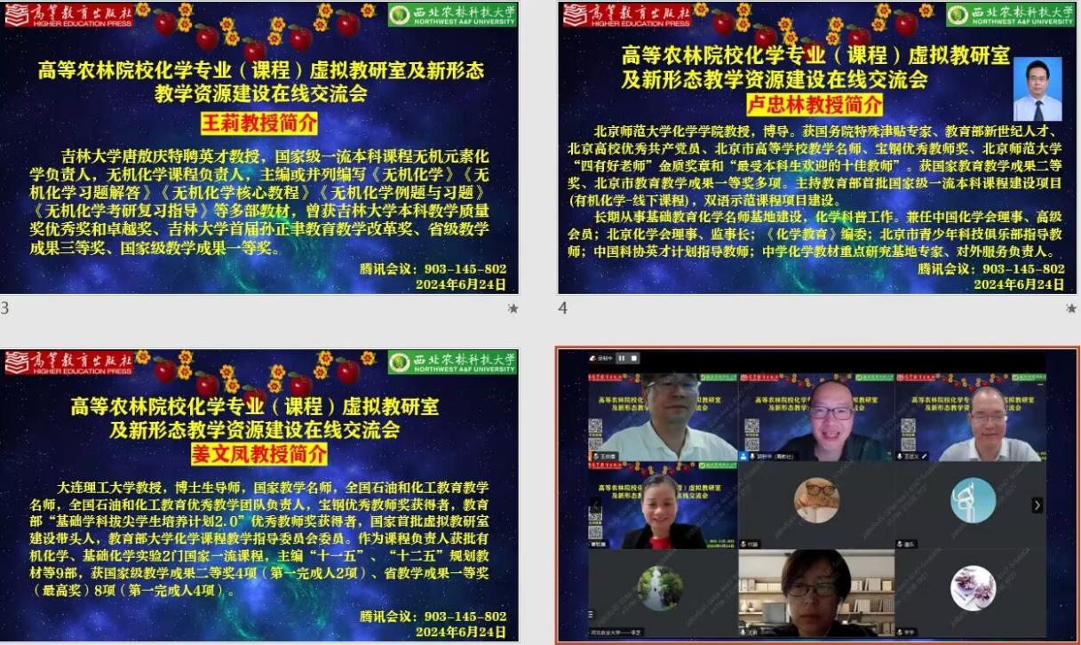 为深入贯彻2024年全国教育工作会议精神,推动教育数字化战略行动及高等学校高质量教材体系建设,高等农林院校化学专业(课程)虚拟教研室及新形态教学资源建设在线交流会于2024年6月24日召开。本次专题研讨会由高等教育出版社郭新华编审和age动漫 王俊儒教授共同主持,来自全国20余所高校的院长、虚拟教研室负责人、一线教师等近百人参会。age动漫 院长王进义教授致辞。他指出,去年年初至今连续举办的十余场次全国性系列课程研讨会对于推动新时期高等农林院校化学专业(课程)建设具有重要意义。
